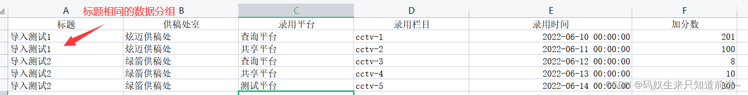 private final static String data = "[{\"contributorsOffice\":\"炫迈供稿处\",\"employedColumn\":\"cctv-1\",\"employedTime\":1654790400000,\"platformManagementName\":\"查询平台\",\"score\":201,\"title\":\"导入测试1\"},{\"contributorsOffice\":\"炫迈供稿处\",\"employedColumn\":\"cctv-2\",\"employedTime\":1654876800000,\"platformManagementName\":\"共享平台\",\"score\":100,\"title\":\"导入测试1\"},{\"contributorsOffice\":\"绿箭供稿处\",\"employedColumn\":\"cctv-3\",\"employedTime\":1654963200000,\"platformManagementName\":\"查询平台\",\"score\":8,\"title\":\"导入测试2\"},{\"contributorsOffice\":\"绿箭供稿处\",\"employedColumn\":\"cctv-4\",\"employedTime\":1655049600000,\"platformManagementName\":\"共享平台\",\"score\":10,\"title\":\"导入测试2\"},{\"contributorsOffice\":\"绿箭供稿处\",\"employedColumn\":\"cctv-5\",\"employedTime\":1655136000000,\"platformManagementName\":\"测试平台\",\"score\":300,\"title\":\"导入测试2\"}]";