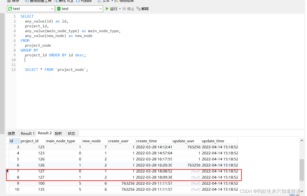 问题出现了,如果需要取其他字段的值,any_value()取的多条记录第一条数据的字段,导致数据可能存在问题。如下图: