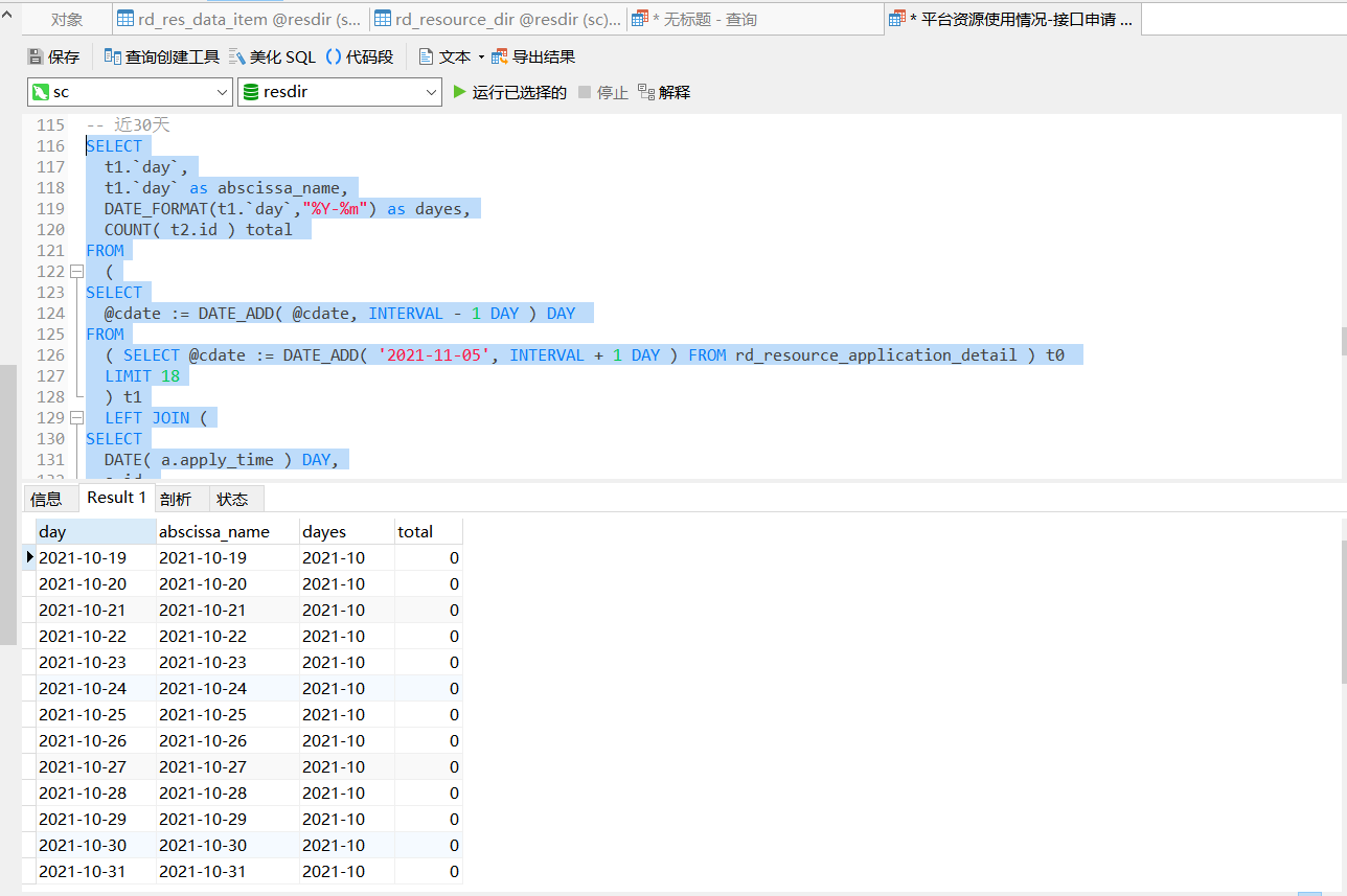 1、按天统计,统计区间的所有天数的数据,没有的赋值为0