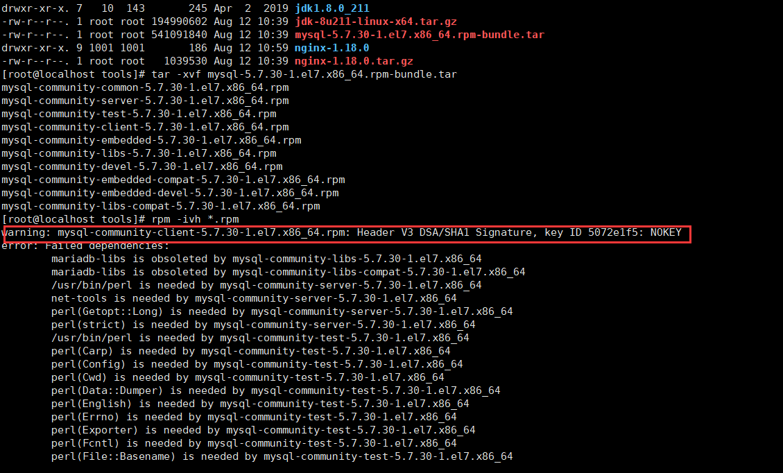 rpm -ivh *.rpm,如果报错,可能是安装顺序不对 - 报错信息为:warning: mysql-community-client-5.7.30-1.el7.x86_64.rpm: Header V3 DSA/SHA1 Signature, key ID 5072e1f5: NOKEY