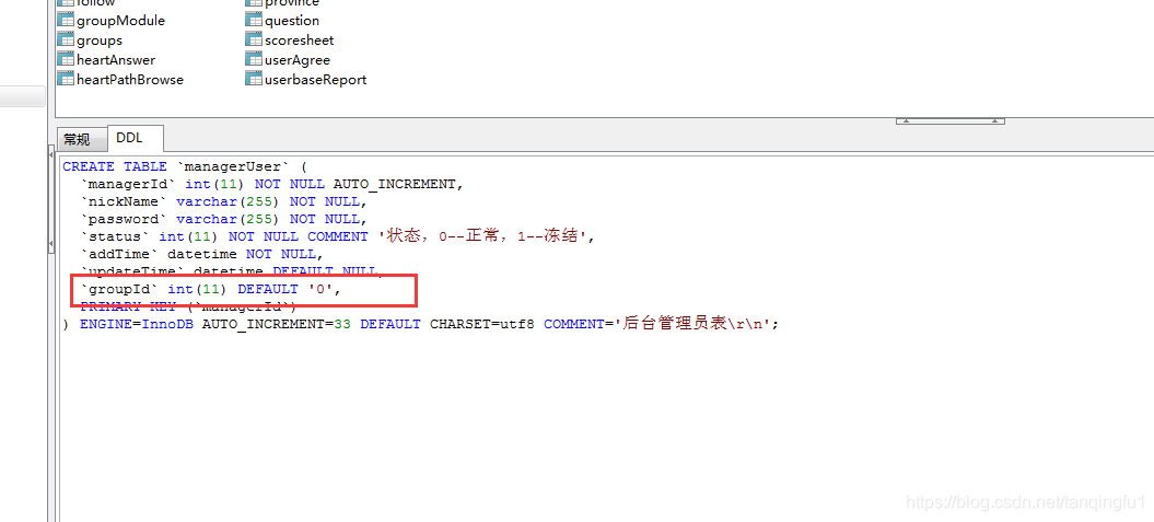 `groupId` int(11) DEFAULT NULL, '分组ID'