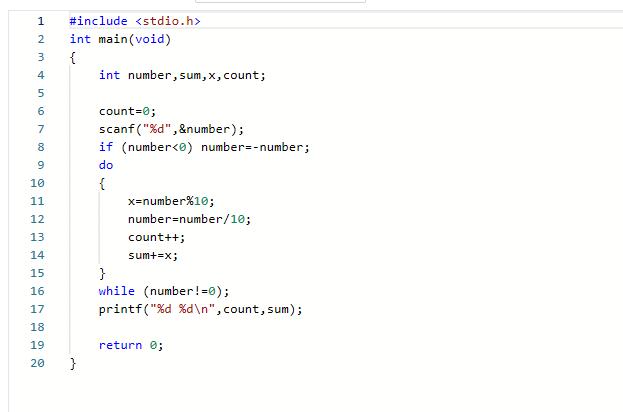 问题描述:对于给定的正整数N,求它的位数及其各位数字之和。