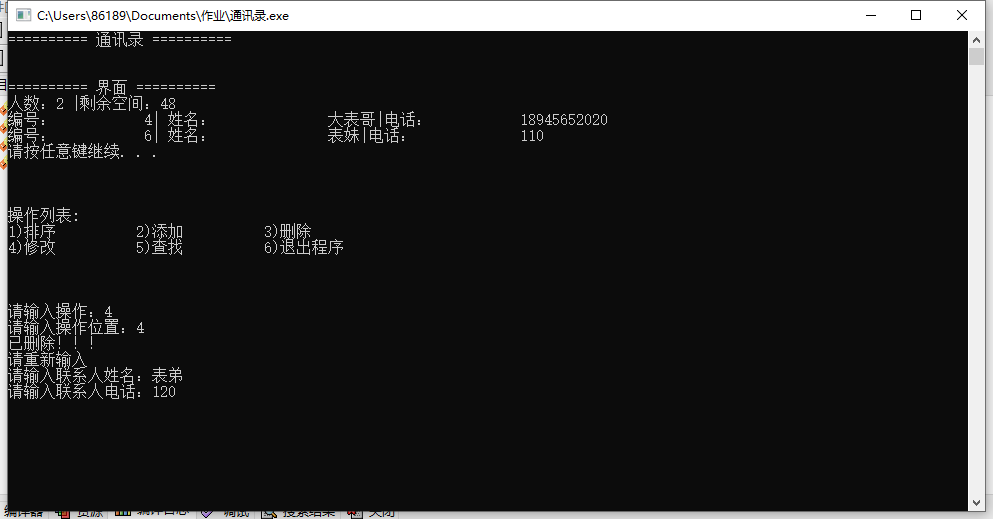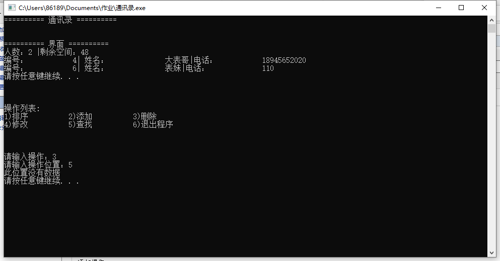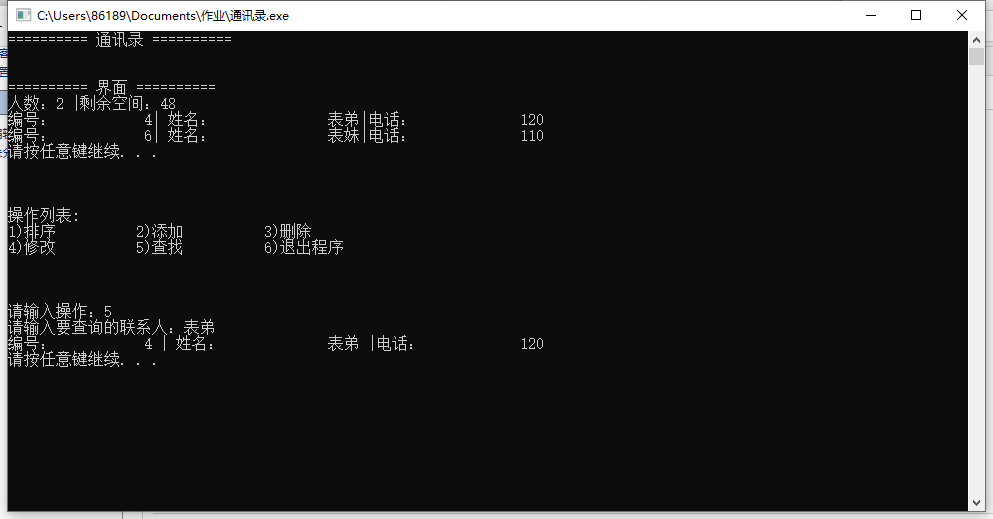 查找功能:输入名字或者电话号码后,输出对应的编号姓名和电话号码
