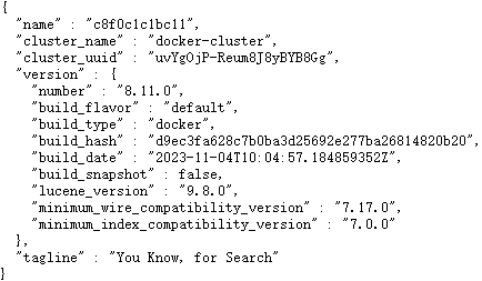 #单节点模式,9200端口(Web管理平台端口) 9300(服务默认端口),映射了yml需先创建配置文件 docker run -d \ --name es \ -e "ES_JAVA_OPTS=-Xms512m -Xmx512m" \ -e "discovery.type=single-node" \ -v /data/es/config/elasticsearch.yml:/usr/share/elasticsearch/config/elasticsearch.yml \ -v /data/es/data:/usr/share/elasticsearch/data \ -v /data/es/plugins:/usr/share/elasticsearch/plugins \ --privileged \ --network es-net \ -p 9200:9200 \ -p 9300:9300 \ elasticsearch:8.11.0