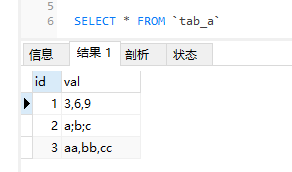 1 select 2 (SELECT GROUP_CONCAT(b.id) from tab_b b 3 INNER JOIN 4 (SELECT 5 help_topic_id+1 as ID, 6 SUBSTRING_INDEX(SUBSTRING_INDEX(a.val,';',help_topic_id+1),';',-1) AS `value` 7 FROM 8 mysql.help_topic 9 WHERE 10 help_topic_id < LENGTH(a.val)-LENGTH(REPLACE(a.val,';',''))+1) t 11 on b.val = t.`value` and t.`value` != '') 12 from tab_a a where a.id=2 13 14 修改为: 15 16 select 17 (SELECT GROUP_CONCAT(b.id) from tab_b b where FIND_IN_SET(b.val, REPLACE(a.val,';',','))>0 and IFNULL(b.val,'')!='') 18 from tab_a a where a.id=2