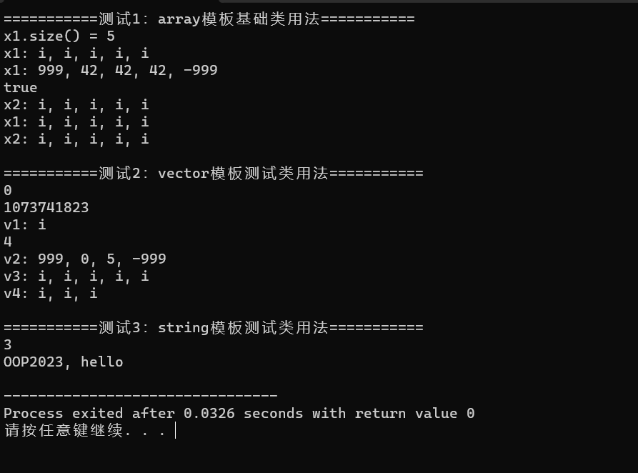 #include<iostream> #include<string> #include<vector> #include<array> template<typename T> void output1(const T &obj){ for (auto i: obj) std::cout << "i" << ", "; std::cout << "\b\b \n"; } template<typename T> void output2(const T &obj) { for(auto p = obj.begin(); p != obj.end(); ++p) std::cout << *p << ", "; std::cout << "\b\b \n"; } void test_array(){ using namespace std; array<int, 5> x1; cout << "x1.size() = " << x1.size() << endl; x1.fill(42); x1.at(0) = 999; x1[4] = -999; cout << "x1: "; output1(x1); cout << "x1: "; output2(x1); array<int, 5>x2=x1; cout << boolalpha <<(x1==x2) <<endl; x2.fill(22); cout << "x2: "; output1(x2); swap(x1,x2); cout << "x1: "; output1(x1); cout << "x2: "; output1(x2); } void test_vector() { using namespace std; vector<int> v1; cout << v1.size() << endl; cout << v1.max_size() << endl; v1.push_back(55); cout << "v1: "; output1(v1); vector<int> v2 {1, 0, 5, 2}; v2.pop_back(); v2.erase(v2.begin()); v2.insert(v2.begin(), 999); v2.insert(v2.end(), -999); cout << v2.size() << endl; cout << "v2: "; output2(v2); vector<int> v3(5, 42); cout << "v3: "; output1(v3); vector<int> v4(v3.begin(), v3.end()-2); cout << "v4: "; output1(v4); } void test_string() { using namespace std; string s1{"oop"}; cout << s1.size() << endl; for(auto &i: s1) i -= 32; s1 += "2023"; s1.append(", hello"); cout << s1 << endl; } int main() { using namespace std; cout << "===========测试1:array模板基础类用法===========" << endl; test_array(); cout << "\n===========测试2:vector模板测试类用法===========" << endl; test_vector(); cout << "\n===========测试3:string模板测试类用法===========" << endl; test_string(); }