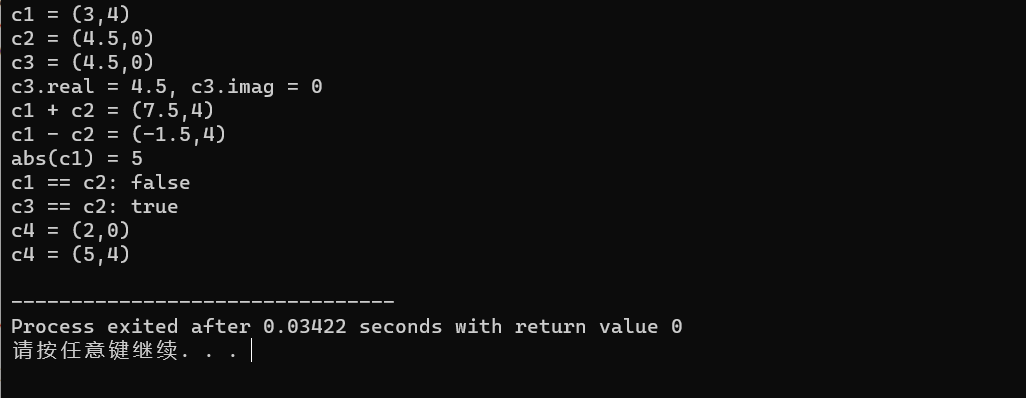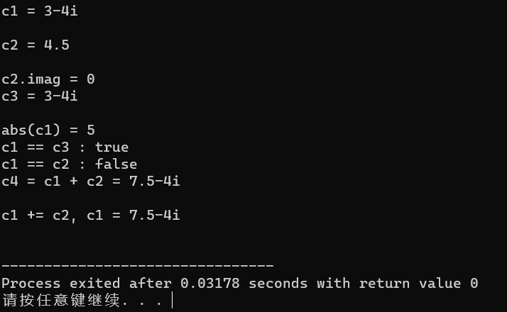#include <iostream> #include <complex> void test_std_complex() { using namespace std; complex<double> c1{3, 4}, c2{4.5}; const complex<double> c3{c2}; cout << "c1 = " << c1 << endl; cout << "c2 = " << c2 << endl; cout << "c3 = " << c3 << endl; cout << "c3.real = " << c3.real() << ", " << "c3.imag = " << c3.imag()<< endl; cout << "c1 + c2 = " << c1 + c2 << endl; cout << "c1 - c2 = " << c1 - c2 << endl; cout << "abs(c1) = " << abs(c1) << endl; cout << boolalpha; cout << "c1 == c2: " << (c1 == c2) << endl; cout << "c3 == c2: " << (c3 == c2) << endl; complex<double> c4 = 2; cout << "c4 = " << c4 << endl; c4 += c1; cout << "c4 = " << c4 << endl; } int main() { test_std_complex(); }