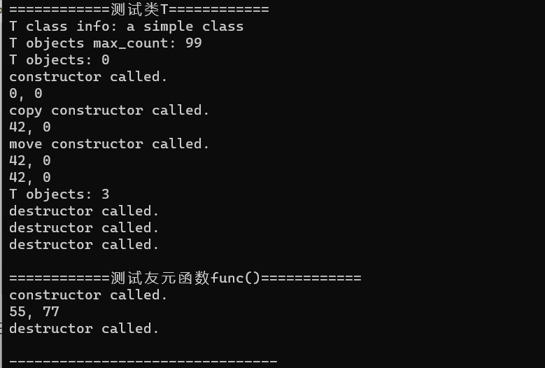 #include <iostream> #include <string> using namespace std; class T { public: T(int x = 0, int y = 0); T(const T &t); T(T &&t); ~T(); void set_m1(int x); int get_m1() const; int get_m2() const; void display() const; friend void func(); private: int m1, m2; public: static void disply_count(); public: static const string doc; static const int max_count; private: static int count; }; const string T::doc{"a simple class"}; const int T::max_count = 99; int T::count = 0; T::T(int x, int y): m1{x}, m2{y} { ++count; cout << "constructor called.\n"; } T::T(const T &t): m1{t.m1}, m2{t.m2} { ++count; cout << "copy constructor called.\n"; } T::T(T &&t): m1{t.m1}, m2{t.m2} { ++count; cout << "move constructor called.\n"; } T::~T() { --count; cout << "destructor called.\n"; } void T::set_m1(int x) { m1 = x; } int T::get_m1() const { return m1; } int T::get_m2() const { return m2; } void T::display() const { cout << m1 << ", " << m2 << endl; } void T::disply_count() { cout << "T objects: " << count << endl; } void func() { T t1; t1.set_m1(55); t1.m2 = 77; t1.display(); } void test() { cout << "T class info: " << T::doc << endl; cout << "T objects max_count: " << T::max_count << endl; T::disply_count(); T t1; t1.display(); t1.set_m1(42); T t2{t1}; t2.display(); T t3{std::move(t1)}; t3.display(); t1.display(); T::disply_count(); } int main() { cout << "============测试类T============" << endl; test(); cout << endl; cout << "============测试友元函数func()============" << endl; func(); }