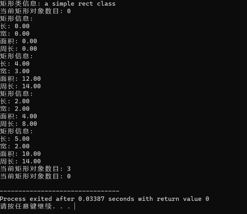 #include <iostream> #include <string> #include <iomanip> using namespace std; class Rect { private: double length; double width; static int count; public: static string doc; Rect() : length(0), width(0) { ++count; } Rect(double l, double w) : length(l), width(w) { count++; } Rect(const Rect& r) : length(r.length), width(r.width) { count++; } ~Rect() { --count; } double area() const { return length * width; } double perimeter() const { return 2 * (length + width); } void resize(double l, double w) { length = l; width = w; } void resize(double s) { length = s; width = s; } friend void output(const Rect& r); static int size_info() { return count; } }; int Rect::count = 0; string Rect::doc { "a simple rect class"}; void output(const Rect &r) { cout << "矩形信息: " << endl; cout << fixed << setprecision(2); cout << "长: " << r.length << endl; cout << "宽: " << r.width << endl; cout << "面积: " << r.area() << endl; cout << "周长: " << r.perimeter() << endl; } void test() { cout << "矩形类信息: " << Rect::doc << endl; cout << "当前矩形对象数目: " << Rect::size_info() << endl; Rect r1; output(r1); Rect r2(4, 3); output(r2); Rect r3(r2); r3.resize(2); output(r3); r3.resize(5, 2); output(r3); cout << "当前矩形对象数目: " << Rect::size_info() << endl; } int main() { test(); cout << "当前矩形对象数目: " << Rect::size_info() << endl; }