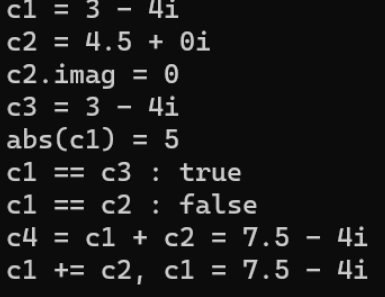 #ifndef Complex_H #include<iostream> #include<cmath> class Complex{ public: Complex(double real = 0.0, double imag = 0.0); Complex(const Complex &c); ~Complex(); double get_real() const; double get_imag() const; void add(const Complex &c); void show() const; friend Complex add(const Complex &c1, const Complex &c2); friend bool is_equal(const Complex &c1, const Complex &c2); friend double abs(const Complex &c); private: double real, imag; }; #endif