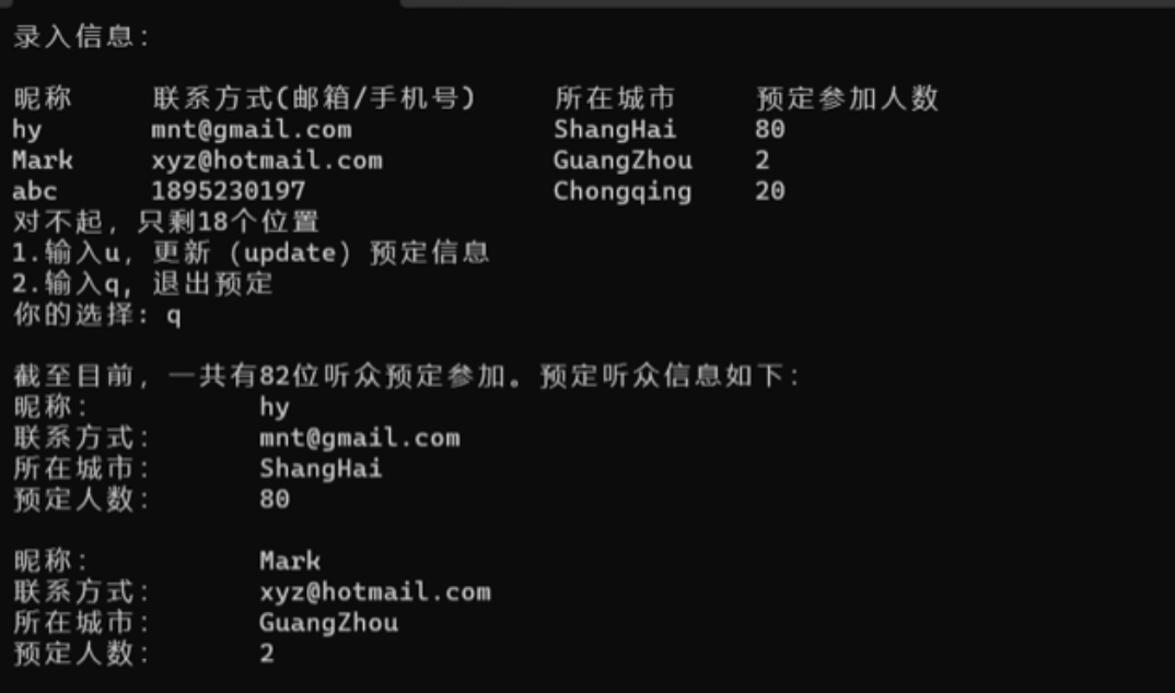 cout << "昵称 联系方式(邮箱/手机号) 所在城市 预定参加人数" << endl;