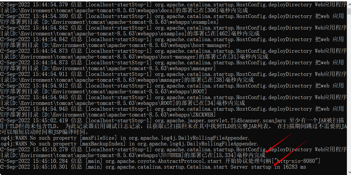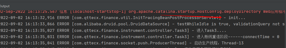 但是界面就卡在完成界面了,因为我们的项目启动后会自动与另外一个c++的的服务程序进行socket通信,正常情况下是会日志打印的,结果等了很久都没有日志信息,开始以为tomcat有问题,但是登录 localhost:8080 能够显示出tomcat的网页的。而且通过postman进行接口测试,有些接口又是可以用的。而且调用一个接口,就会打印相应的日志。