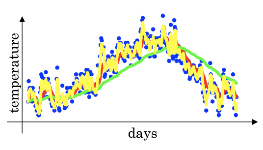 (一年中开头和结尾气温较低,中间气温较高,整体趋势是这样的,但是噪声很大。下图蓝点表示离散的每天温度)