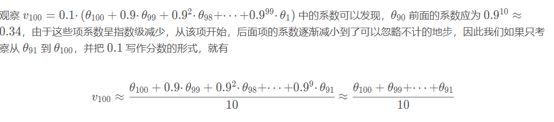 但是为什么说 β = 0.9 时,这里的 v 100 是对前 10 天气温平均值的粗略计算呢?