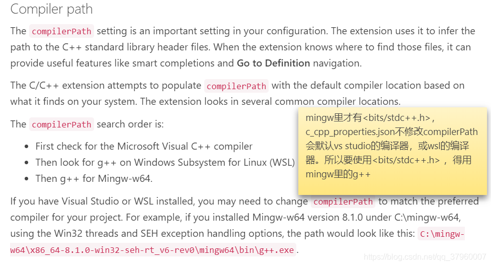 如果你电脑装了visual studio,或者wsl(windows下Linux子系统),vscode会优先用前两者的编译器,如果前两个都没检测到,vscode才会使用mingw,下图官方文档说的很清楚