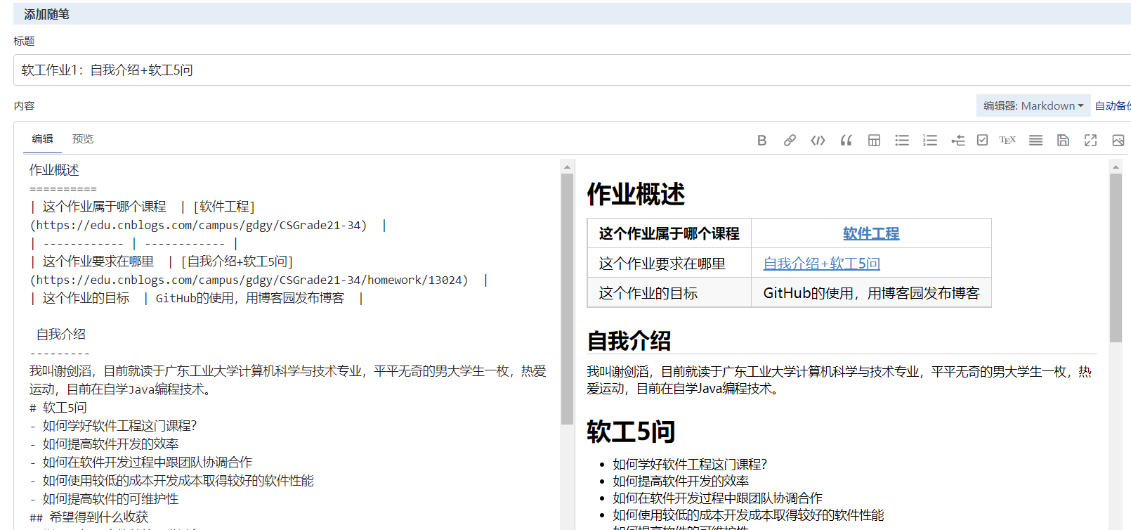 我叫谢剑滔,目前就读于广东工业大学计算机科学与技术专业,平平无奇的男大学生一枚,热爱运动,目前在自学Java编程技术。