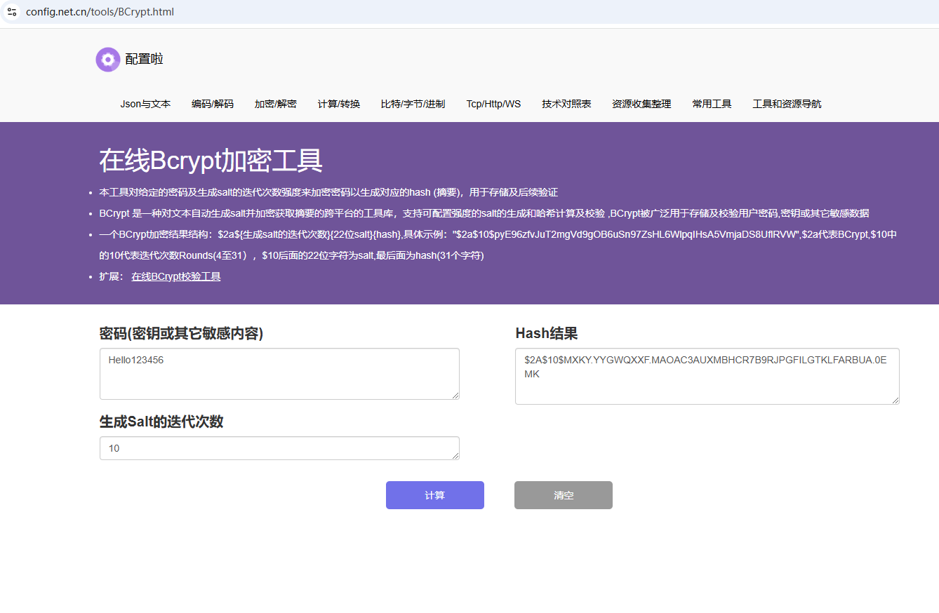 在线Bcrypt在线计算hash(摘要),可指定salt生成强度
