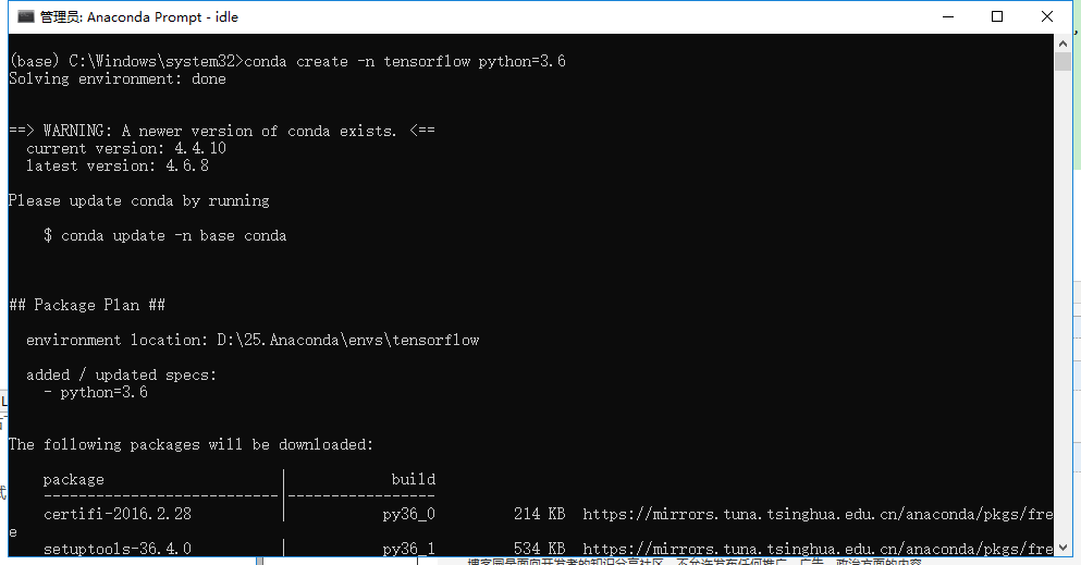 切记:用管理员的身份打开anaconda prompt 然后输入conda create –n tensorflow python=3.6