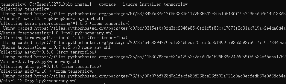 接下来在tensorflow环境中使用pip install --upgrade --ignore-installed tensorflow这个命令