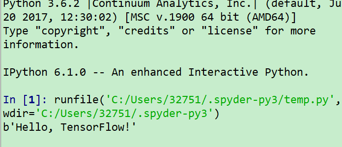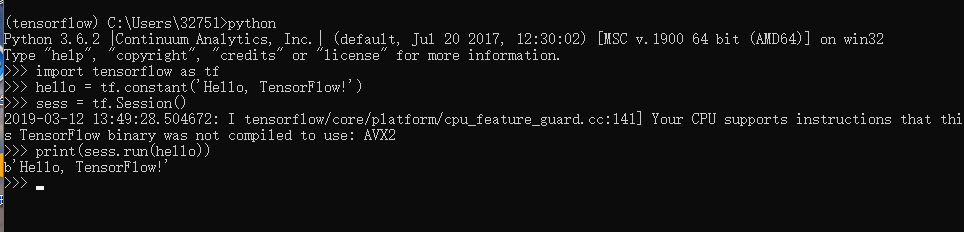 import tensorflow as tf hello = tf.constant('Hello, TensorFlow!') sess = tf.Session() print(sess.run(hello))