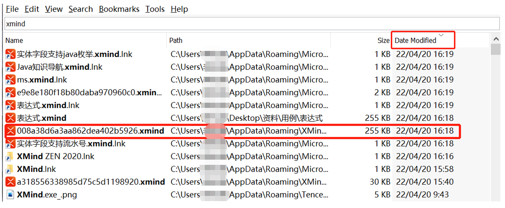 这样我们就找到了今天系统缓存的最新的xmind。这个方法还适用于找其他文档,以前我没用过时间排序,今天发现还有这个妙用。