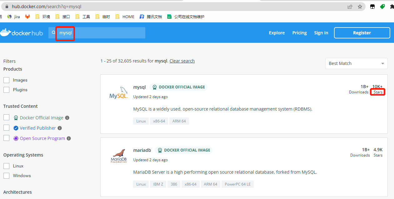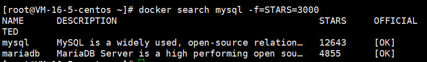 docker search mysql # 这里示例mysql # 可选参数 docker search mysql -f/--filter=STARS=3000 # 搜索收藏数大于3000的镜像源