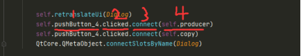 - 在setupUi方法下,添加下面的语句:1是控件,2是动作,3是信号,4是后续动作