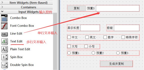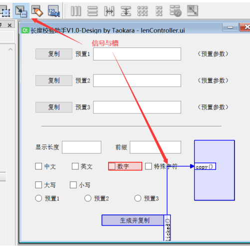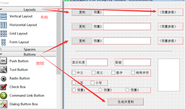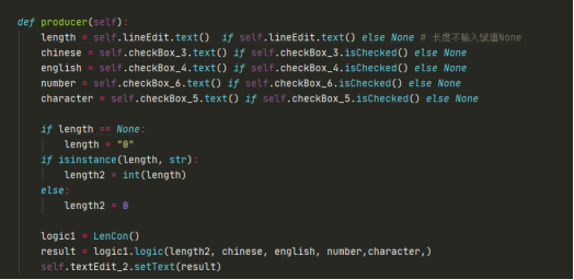 在这个方法中,我们输入或者勾选的,都会产生内容,比如text或者被勾选ischecked等等,就可以对其进行判断,这里面我还调用了个LenCon()方法,这个才是我要实现的内容核心,比如这个函数就是根据你选择的参数进行一个字符串的生成。不过在产生的py文件中编辑有个问题,下次调整了控件之后会导致重新生成,之前添加的会被覆盖,应该搞成装饰器或者继承比较好。