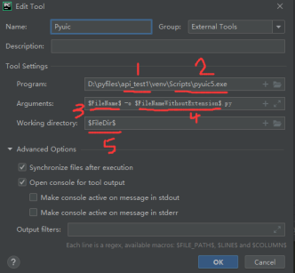 - 添加插件Pyuic(这个是安装pyqt5库就一起安装的,用来把Qt Designer图像化设计的UI界面转化成py文件):1是项目地址,因为我们一开始建立项目选择新环境,所以新环境安装的库是在项目下面的,所以这个2是在项目下的;3是Qt Designer生成的文件,4是要转化成的py文件;5是py文件要存放的地址,这里的变量意思是存放在当前目录。
