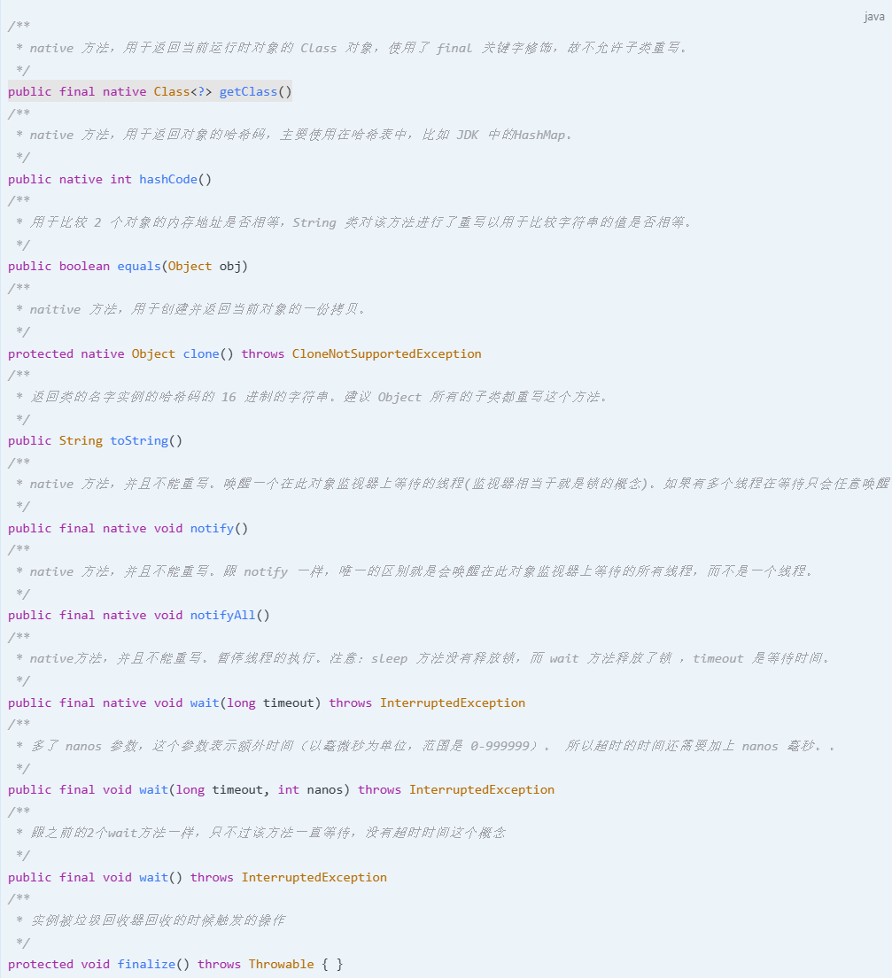 native 方法,用于返回当前运行时对象的 Class 对象,使用了 final 关键字修饰,故不允许子类重写。public final native Class<?> getClass()