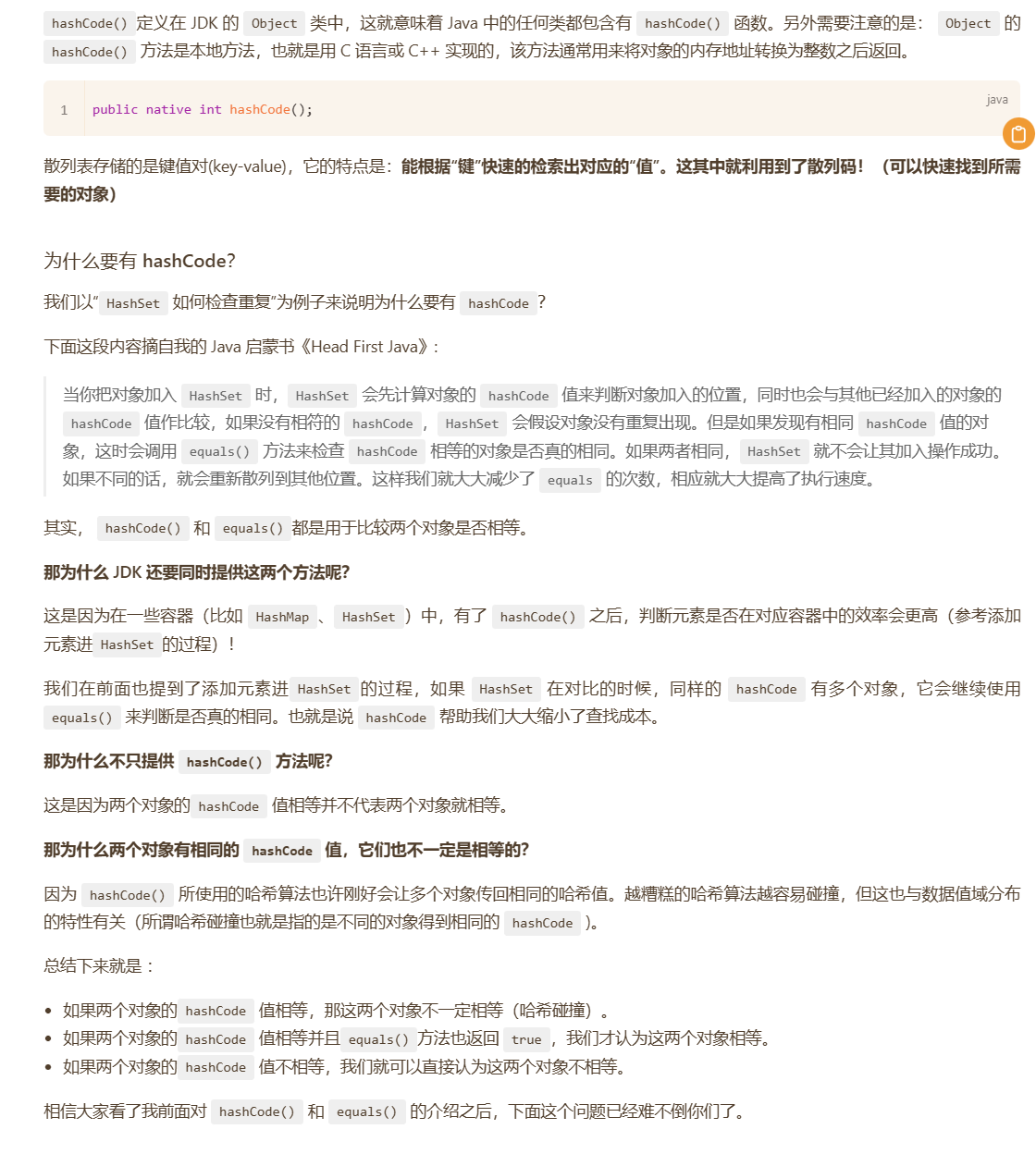思考回答:重写equals()时没有重写hashCode()可能会导致equals方法返回true,而hashCode方法却返回false。这样会导致hashmap、hashset等类中存储多个一模一样的对象,这与Java的思想不符(hashMap只能有唯一的key,hashSet只能有唯一的对象)