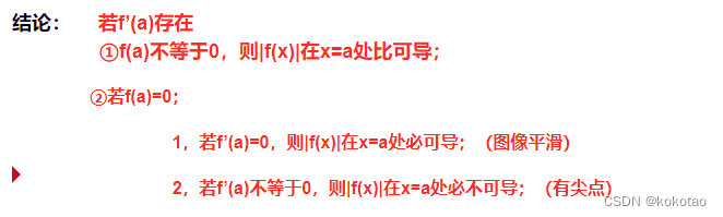 2,若f’(a)不等于0,则|f(x)|在x=a处必不可导;(有尖点)