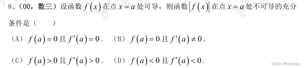 可以知道 f(a)=0,绝对值不可导需要满足 f’(a)不等于0,
