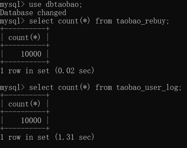查看mysql数据库确实导入rebuy和user_log表分别10000条数据