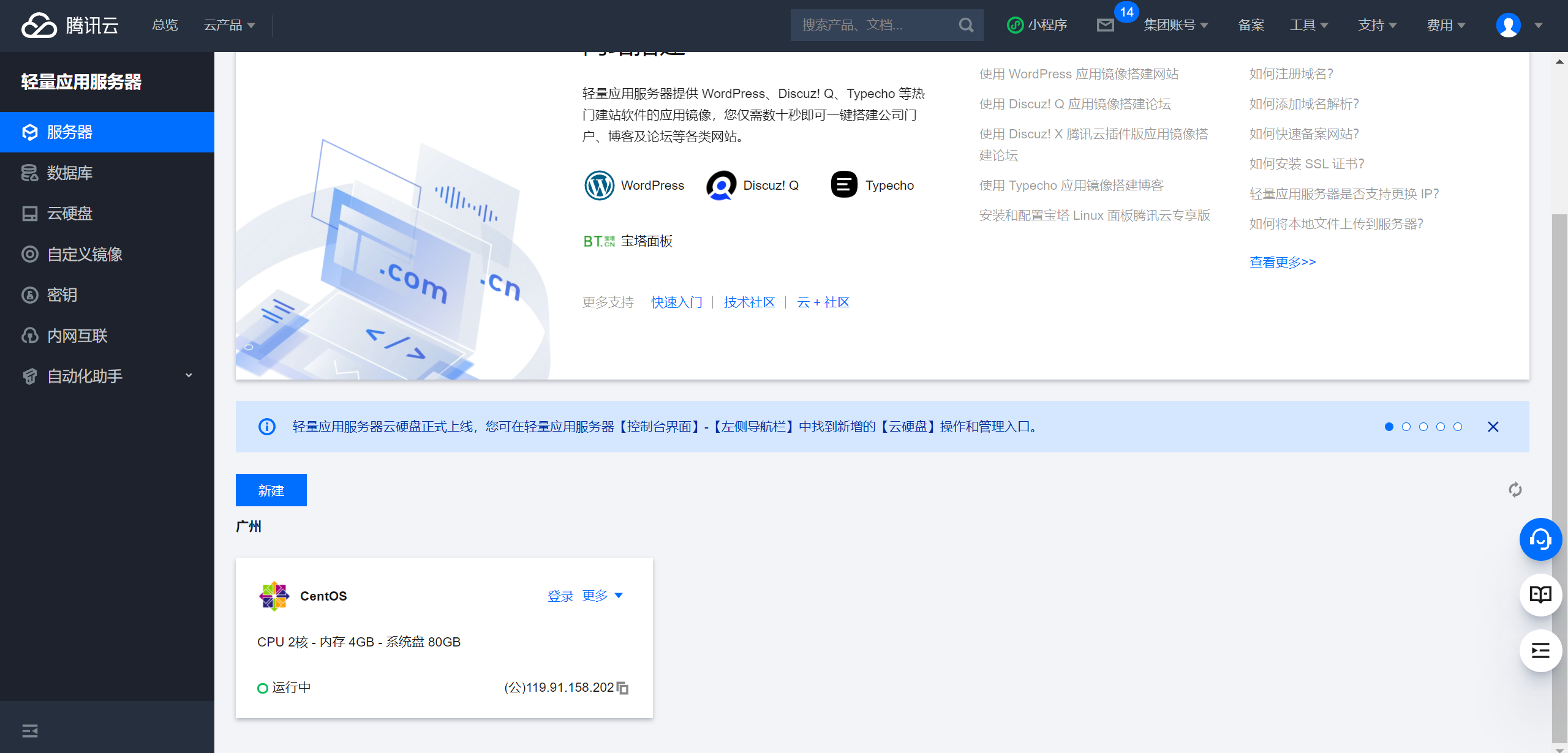首先是购买一个云服务器(这里使用的是腾讯云):
