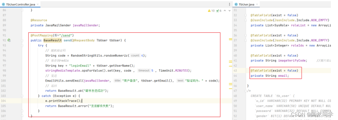 EmailUtils.sendEmail(javaMailSender, "用户登录", tbUser.getEmail(), "验证码为:" + code);