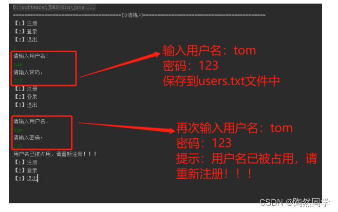 - 输入文件中已经存在的用户名,提示:用户名已被占用,请重新注册!!!