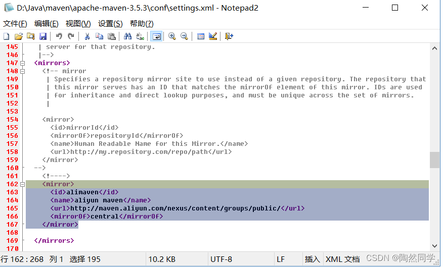 <mirror> <id>alimaven</id> <name>aliyun maven</name> <url>http://maven.aliyun.com/nexus/content/groups/public/</url> <mirrorOf>central</mirrorOf> </mirror>