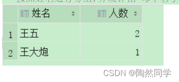 -- 按照姓名进行分组,并统计出 每个名字对应的人数 结果要求显示 名字和 对应的人数 ,结果只显示出名字 包含王的