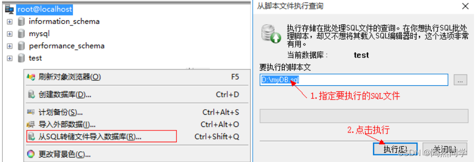 数据库列表区域右键“从SQL转储文件导入数据库”,指定要执行的SQL文件,执行即可。