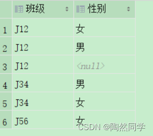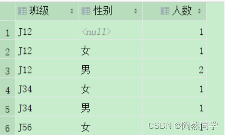 | -- 需求1: 统计出 各个班级中存在的性别 select className 班级,psex 性别 from person group by psex, className; -- 需求2: 统计出 各个班级中存在的性别 按照班级排序 select className 班级,psex 性别 from person group by psex, className order by className; -- 需求3: 各个班级中存在的年龄 显示班级和年龄 select className 班级 , page 年龄 from person group by className, page order by className; -- 需求4 : 统计出 各个班级中对应性别的人数. 需要显示的字段是 班级 性别 人数, 展示的结果再按照 班级名字排序 select className 班级 ,psex 性别,count(*) 人数 from person group by className, psex order by className; -- 需求5: 统计出 各个班级中存在的年龄,以及该年龄对应的人数 结果用班级名字排序 select className 班级,page 年龄 ,count(page) 人数 from person group by page, className order by className; |