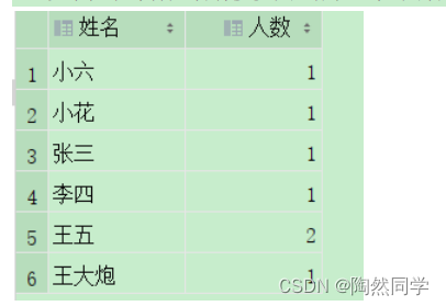 -- 统计表中每种姓名有多少人 结果显示 人名和人数