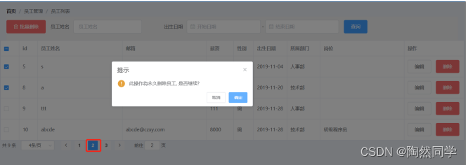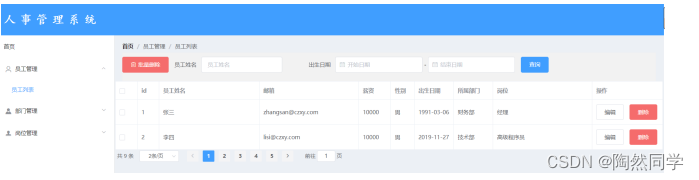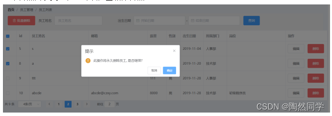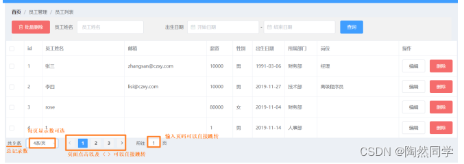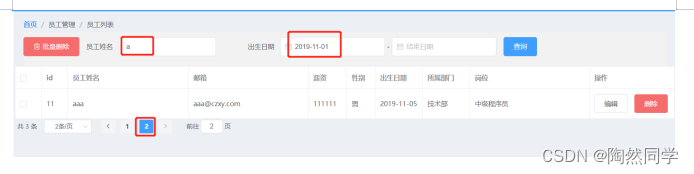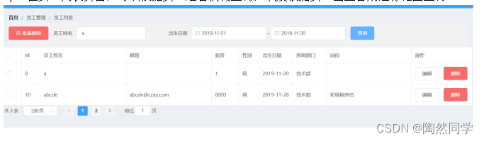 - 在员工列表页面,可以根据员工姓名模糊查询,以及根据员工出生日期进行范围查询
