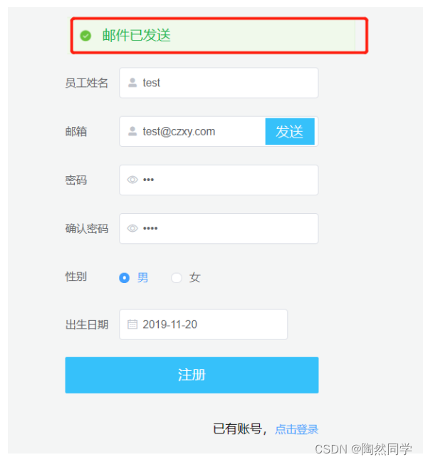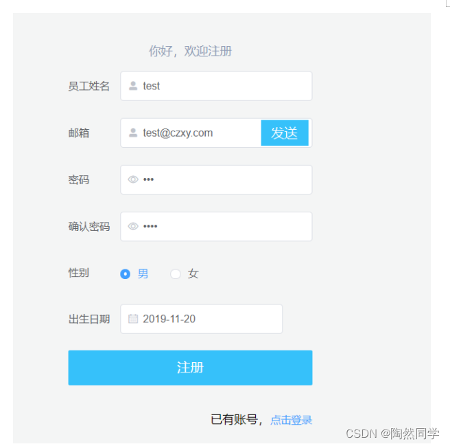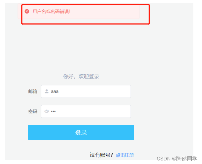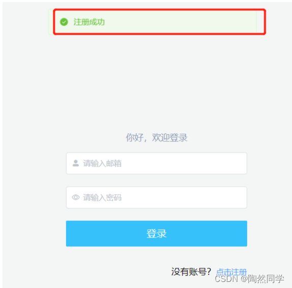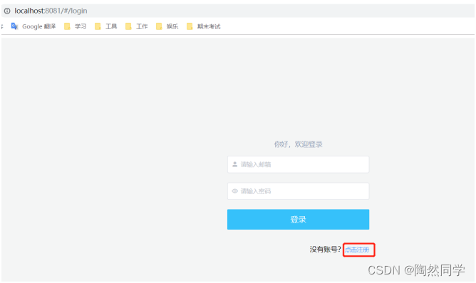 访问 http://localhost:8081/#/login 展示登录页面,点击“点击注册”按钮,进入注册页面