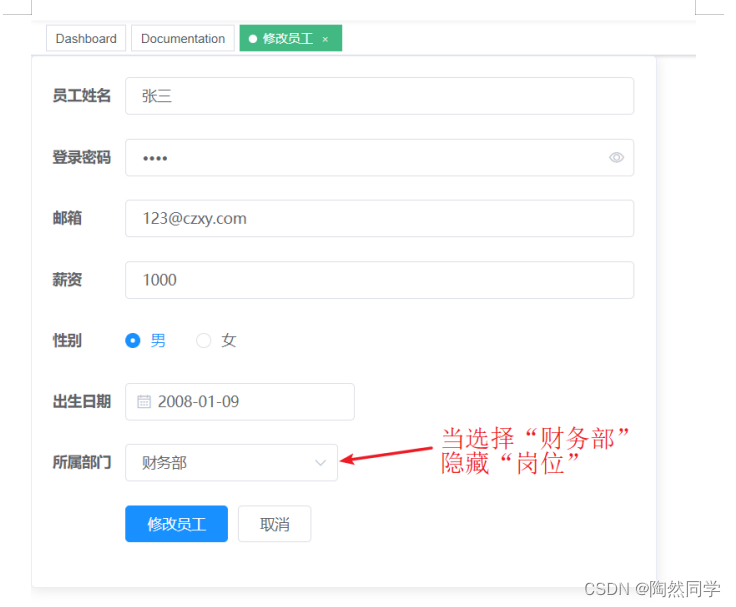 - 点击【编辑】按钮,跳转到修改页面,可以对当前行员工进行修改