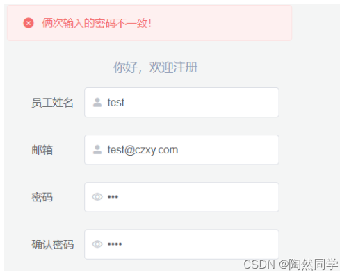 - 密码与确认密码不一致:提示“俩次输入的密码不一致”