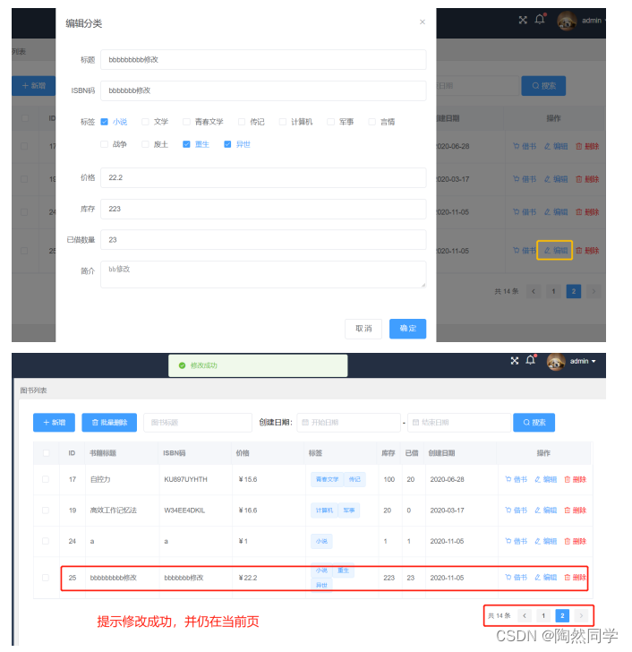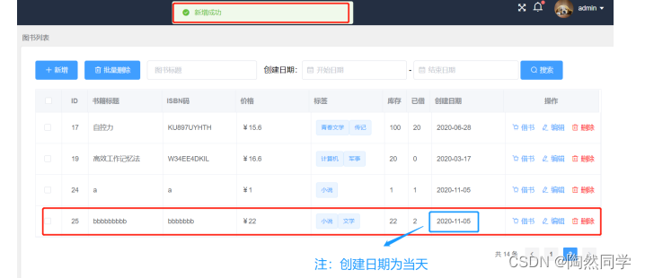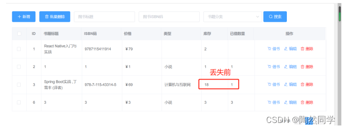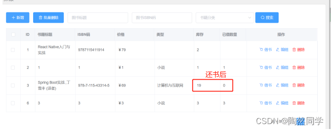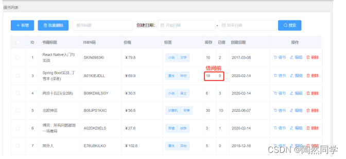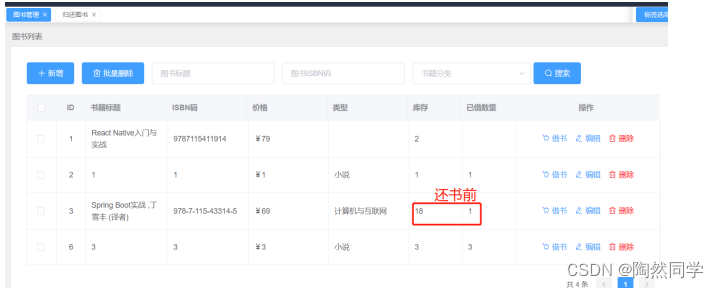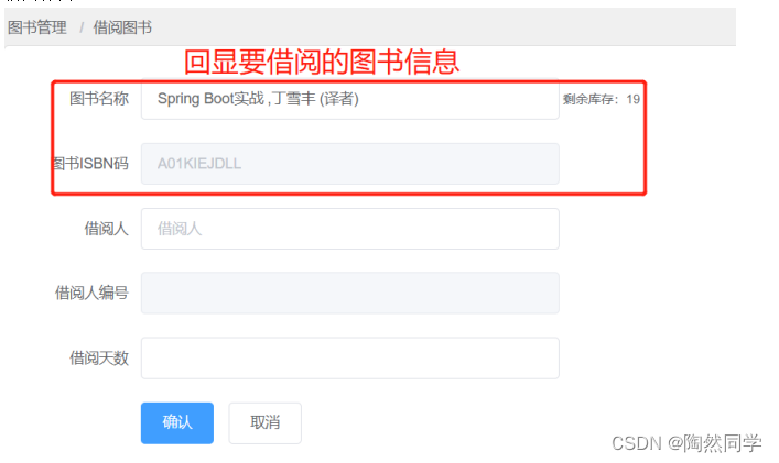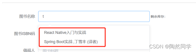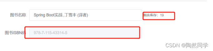2.选中书籍后,回显图书ISBN编码和剩余库存数据