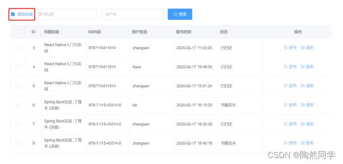 在【归还图书】界面,勾选【查看全部】可以查看所有书籍的借阅、归还、丢失记录。