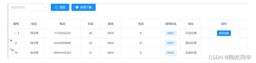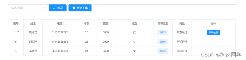 3.2员工列表展示,查询当前员工以及同级别员工信息以及下属员工信息。列如用项经理帐号登录,岗位级别为2,可以查看自己的信息,还有岗位级别为2的其他员工信息,以及项经理的下属信息(不可查看其他经理下属信息)