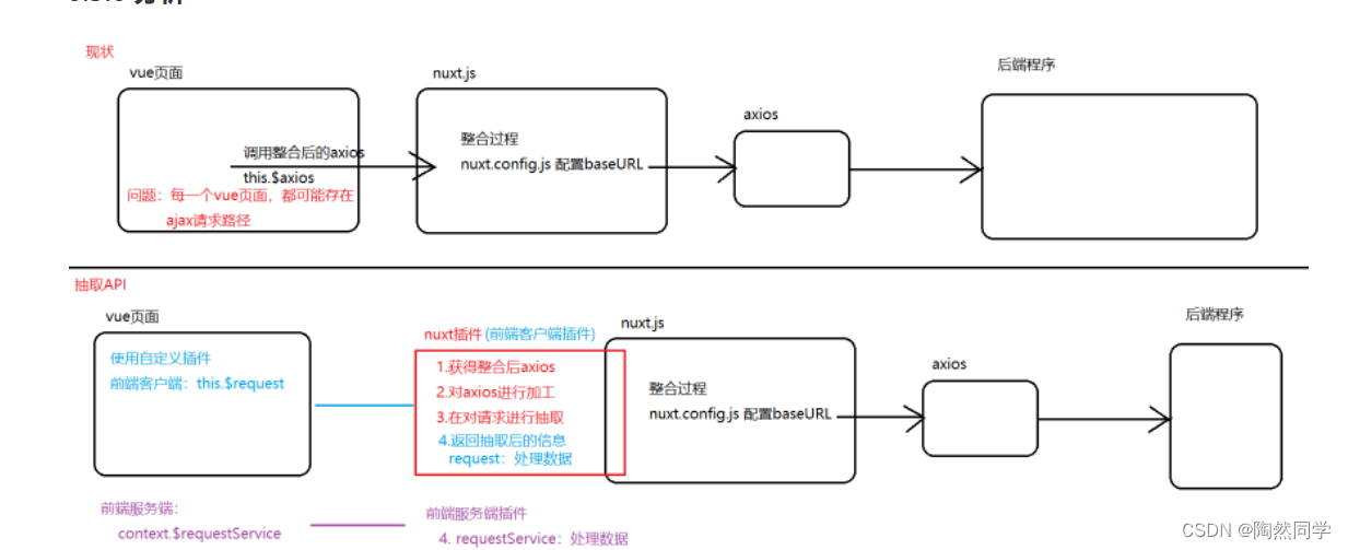 plugins/api.server.js对 内置的 $axios进行增强<span style="background-color:#f8f8f8"><span style="color:#770088">const</span> <span style="color:#0000ff">request</span> <span style="color:#981a1a">=</span> { <span style="color:#000000">test</span> : (<span style="color:#0000ff">params</span>) <span style="color:#981a1a">=></span> { <span style="color:#770088">return</span> <span style="color:#000000">axios</span>.<span style="color:#000000">get</span>(<span style="color:#aa1111">'/service-consumer/feign/echo/abc'</span>,{ <span style="color:#000000">params</span> }) }, } <span style="color:#770088">var</span> <span style="color:#0000ff">axios</span> <span style="color:#981a1a">=</span> <span style="color:#221199">null</span> <span style="color:#770088">export</span> <span style="color:#770088">default</span> ({ <span style="color:#0000ff">$axios</span>, <span style="color:#0000ff">redirect</span>, <span style="color:#0000ff">process</span> }, <span style="color:#0000ff">inject</span>) <span style="color:#981a1a">=></span> { <span style="color:#aa5500">//赋值</span> <span style="color:#000000">axios</span> <span style="color:#981a1a">=</span> <span style="color:#0055aa">$axios</span> <span style="color:#aa5500">//4) 将自定义函数交于nuxt</span> <span style="color:#aa5500">// 使用方式1:在vue中,this.$requestServer.xxx()</span> <span style="color:#aa5500">// 使用方式2:在nuxt的asyncData中,content.app.$requestServer.xxx()</span> <span style="color:#0055aa">inject</span>(<span style="color:#aa1111">'requestServer'</span>, <span style="color:#000000">request</span>) } </span> -